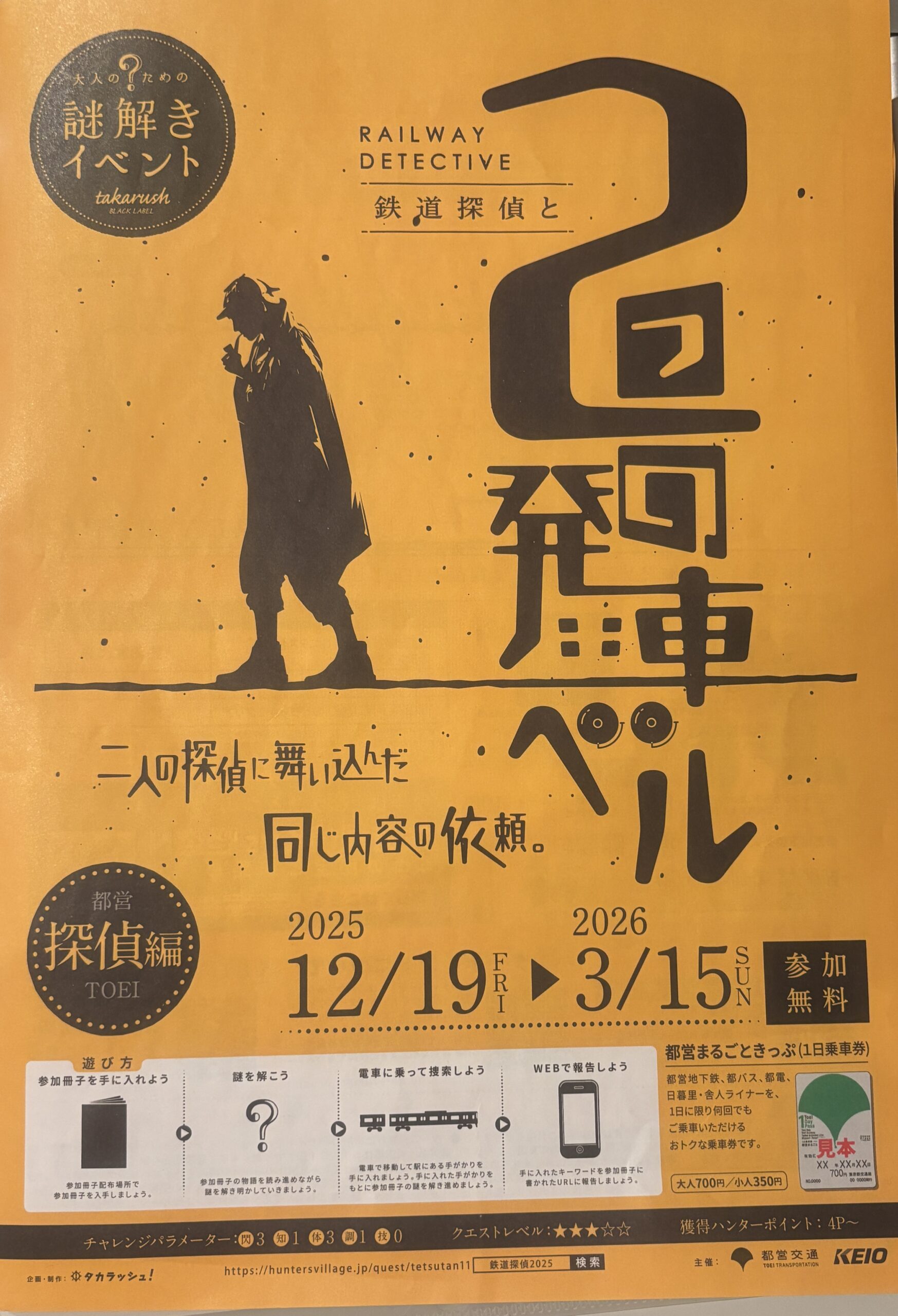 こちらなんと参加費無料。謎解きに必要な冊子は駅で自由に入手できます。(※交通費はかかります)