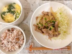 豚肉を解凍して玉ねぎの残りをくし切りにして調味料と炒める。